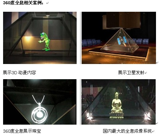 深圳時代中視科技發展有限公司 360度全息幻影成像系統360全息也稱360度全息和360度全息成像,我們在這里稱它為360度全息成像。360全息成像也被稱之為三維全息影像、全息三維成像,它是由透明材料制成的四面錐體,觀眾的視線能從任何一面穿透它,通過表面鏡射和反射,觀眾能從錐形空間里看到自由飄浮的影像和圖形。四個視頻發射器將光信號發射到這個錐體中的特殊棱鏡上,匯集到一起后形成具有真實維度空間的立體影像。